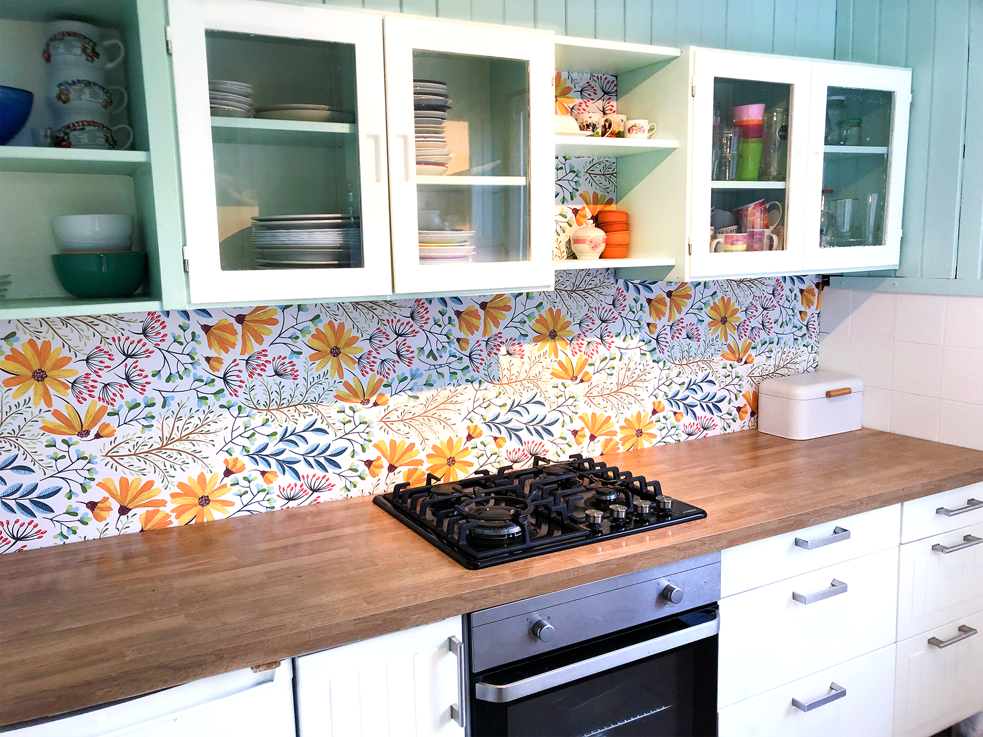 Originally built in the 1980s, the house’s natural wood walls and ceilings were refreshed with soft white, muted gray, and mint green tones, brightening the space and creating an airy, inviting atmosphere. The design maximizes natural light and incorporates floral and nature-inspired hues, seamlessly blending the interior with its lush surroundings.